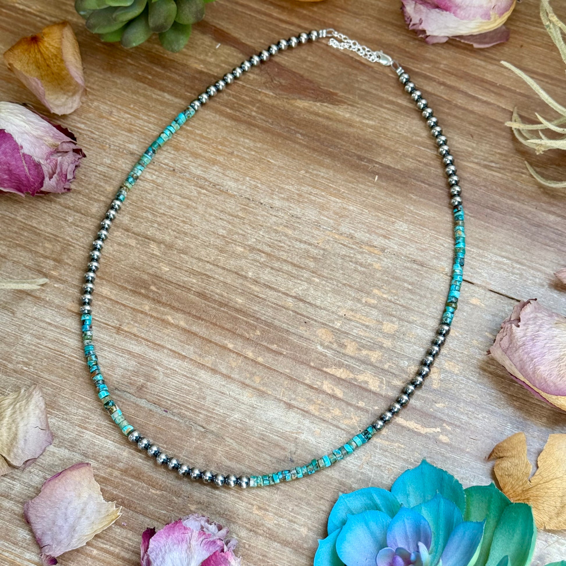 This beautiful 20 inch Heishi turquoise necklace is handcrafted with natural 4mm Heishi turquoise beads and 5mm sterling silver pearls, finished with sterling silver findings and an extender for adjustable length and comfortable wear. Each turquoise bead features unique color and natural variations, making every necklace truly one of a kind.