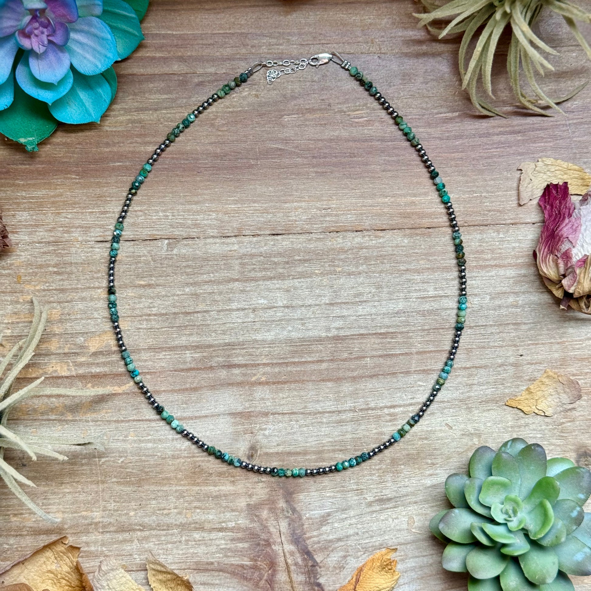 his necklace is hand-strung in our North Texas warehouse using 3mm sterling silver beads paired with faceted African turquoise — known for its rich mix of greens, blues, and natural matrix.