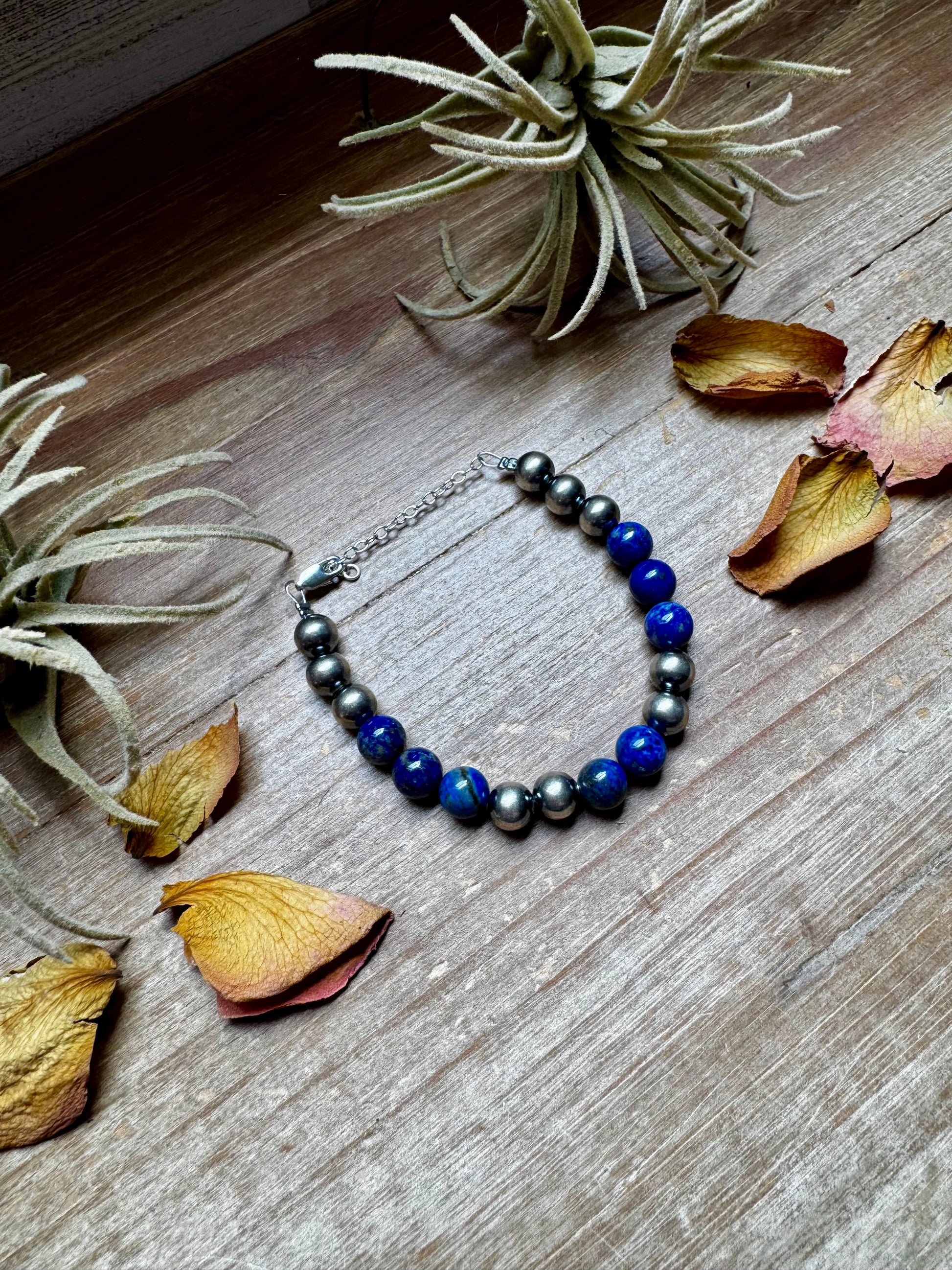 A beautiful combination of rich blue lapis and classic sterling silver. This bracelet is 6.5 inches long with an extender for a comfortable fit. It features 8 mm round lapis beads, each with its own natural variation, paired with 8 mm sterling silver pearls. Finished with a sterling silver lobster clasp and extender chain. Perfect for layering or wearing on its own.