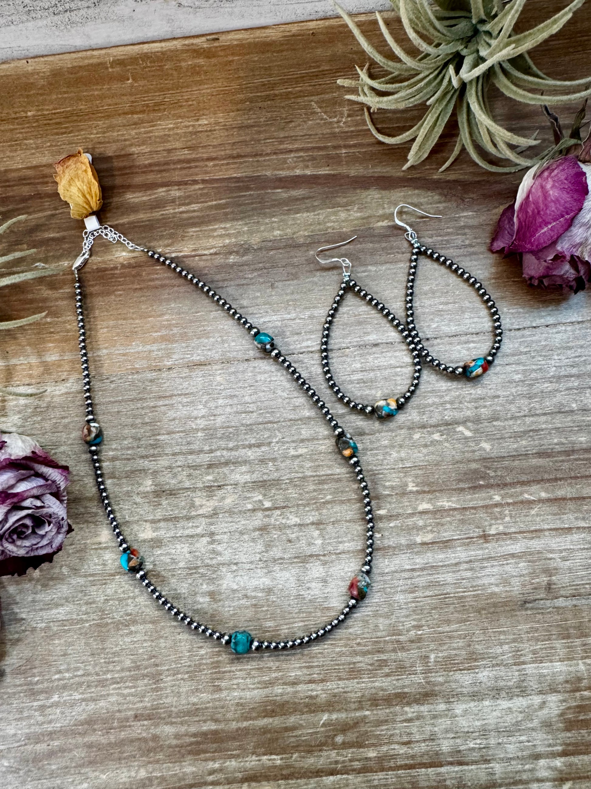 Handmade in the USA by The Bijoux FAB, these teardrop earrings feature a vibrant mix of natural turquoise and spiny oyster accented with 3mm and 4mm sterling silver pearls. Each earring is individually crafted and completely unique, with variations in the color and pattern of the stones that make every pair one of a kind. Measuring approximately 3 inches long, they’re finished with sterling silver hooks for a lightweight, comfortable fit. Perfect for adding color to any look — or pairing with our matching turquoise and spiny oyster necklace.