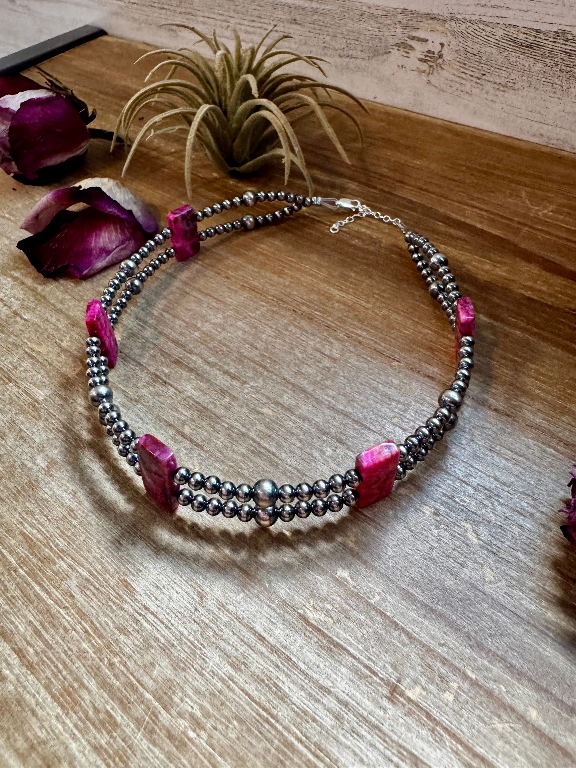 This double strand choker-style necklace measures 13 inches with an extender and is crafted with 4mm and 6mm sterling silver pearls. It features stunning rectangle variscite PINK beads with rich, earthy tones. Though it may look compact when hanging, it lays beautifully on the neck once worn. Finished with a sterling silver lobster clasp and extender. Limited edition – only a few were made.